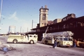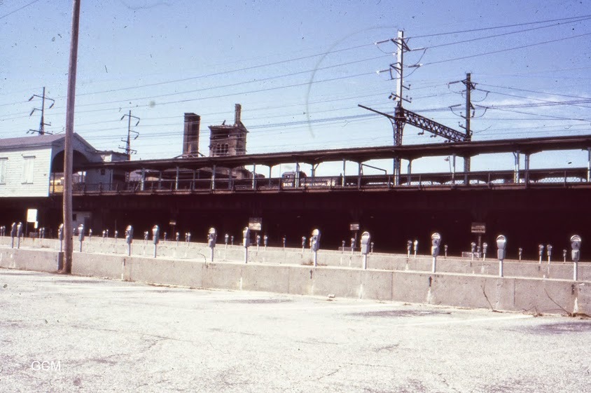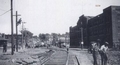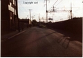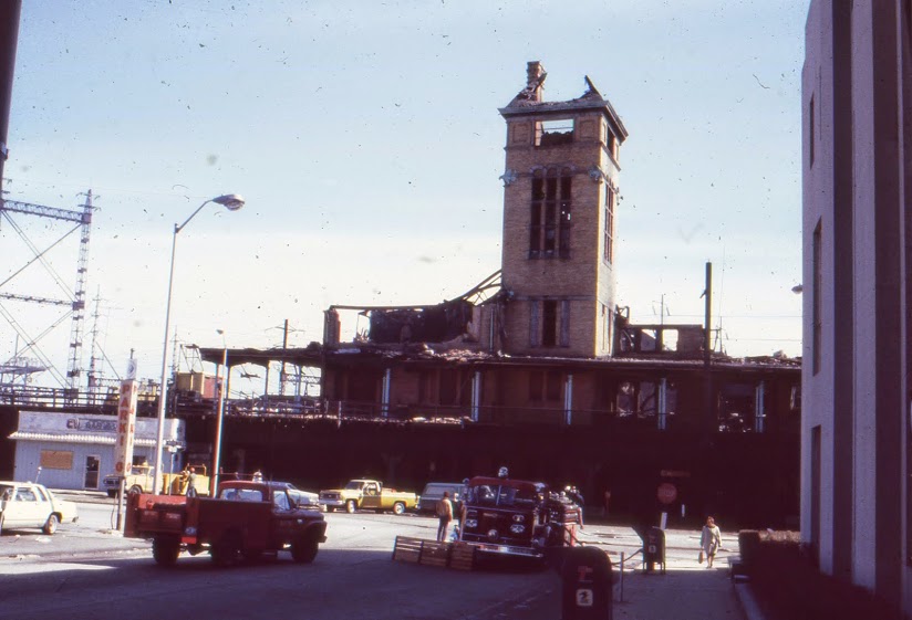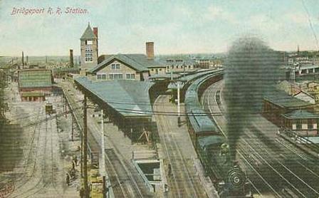 The old Bridgeport,Ct. Railroad Station. On the left is the old Housatonic RR Line going North to Newtown,Botsford,Ct. This station burned 1970's? with suspicious causes. Never solved.(or pursued?) Observe the Trollies in street below.