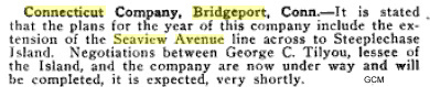 Maps or other information are rare but a line to Steeplechase Island (Pleasure Beach) ? The Trolley company was owned by the New Haven Railroad of which also owned Seaview Railroad. A problem with this railroad as to locations/maps were that the line(s) often were in city streets as a trolley was normally but this was also an industrial railroad.